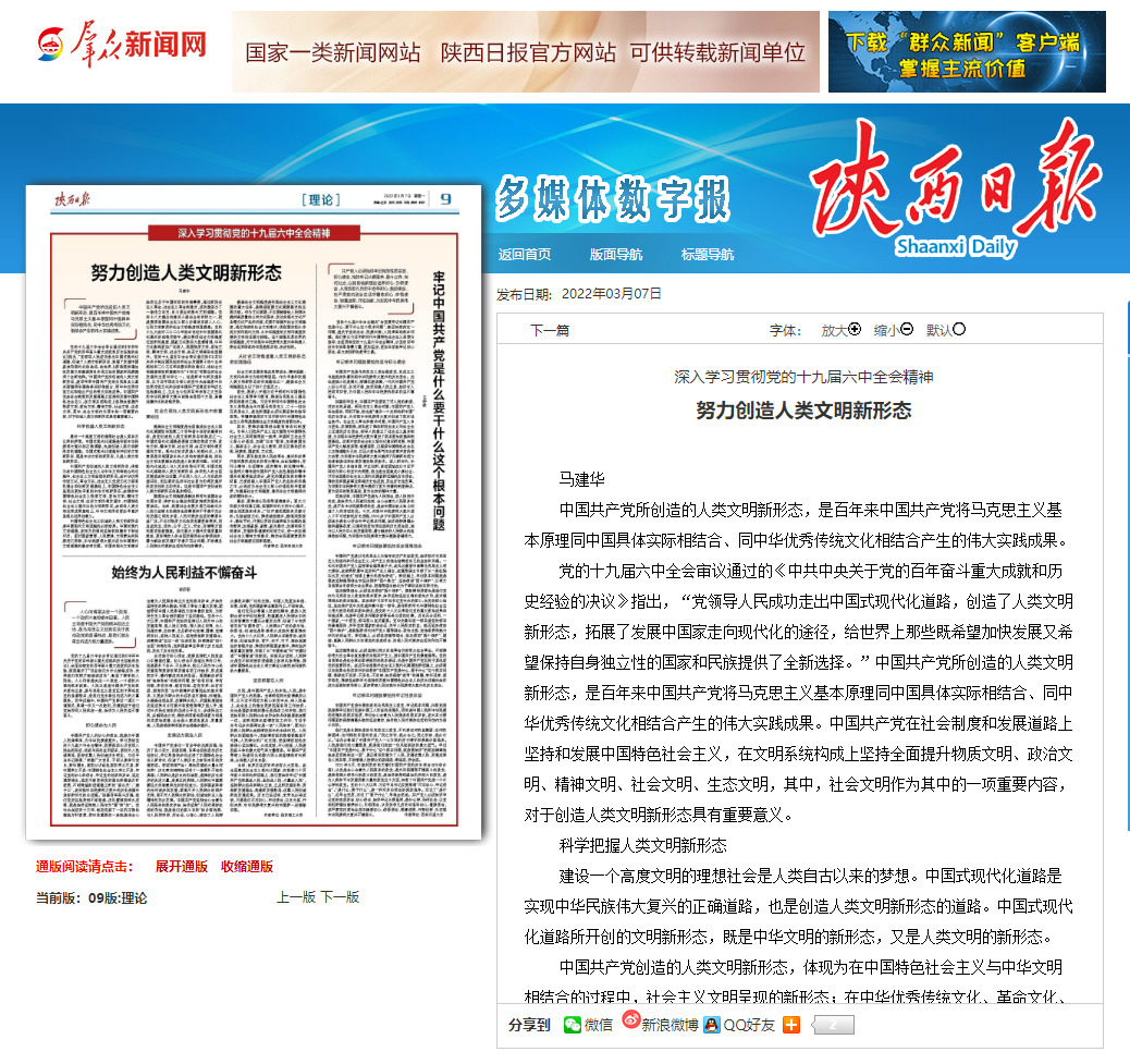 3月7日,《陕西日报》在09理论版发表了公司副教授马建华的理论文章《努力创造人类文明新形态》。