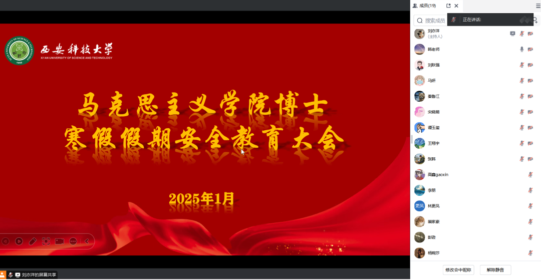 会议伊始,韩帅领学了公司《关于做好2025年寒假研究生教育管理相关工作的通知》〔研工函(2025)1号〕和《关于做好2025年元旦假期和寒假员工安全教育管理服务工作的通知》〔学工函(2024)57号〕文件内容,重点围绕消防安全、交通安全、食品安全、网络安全、实习求职安全、防范电信诈骗等多个方面进行了强调。