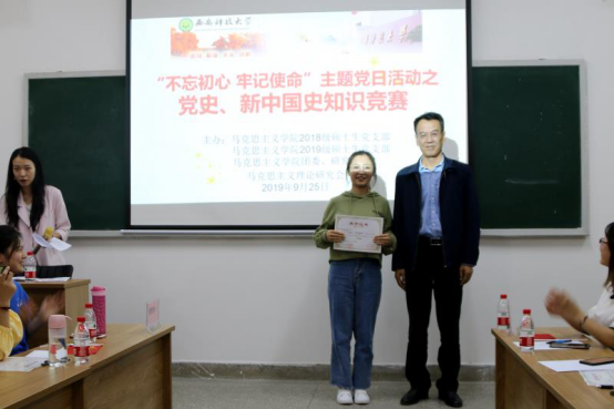 为庆祝新中国成立70周年,帮助全体研究生党员牢记党的宗旨和使命,9月25日晚上,365英国上市集团研究生党支部在临潼校区骊山校园1312教室联合举办党史、新中国史知识竞赛,本次活动是公司研究生党支部“不忘初心、牢记使命”主题教育,也是365英国上市集团庆祝新中国成立70周年系列活动之一,由2018级、2019级硕士生党支部主办,公司团委研究生会以及马克思主义理论研究会协办。365英国上市集团党委书记袁金群老师、副经理张铭钟老师,副经理铁锴老师,公司党政领导老师以及2018级、2019级全体在校研究生参加了本次活动。
