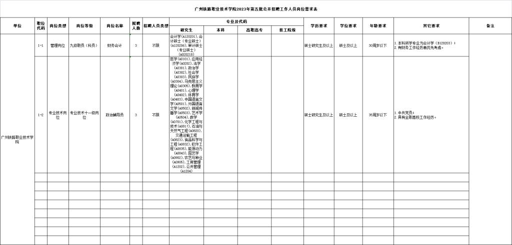 具体详见《广州铁路职业技术公司2023年第五批公开招聘工作人员岗位需求表》(以下简称:岗位需求表)(附件1)。岗位条件中提及的专业名称代码参照《广东省2023年考试录用公务员专业参考目录》(附件2)执行。谷贤教育提醒您,更多招聘信息请关注公众号 高校人才招聘
