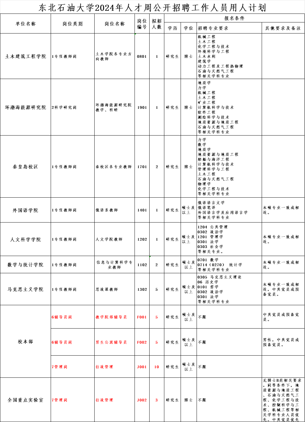 本次计划招聘事业单位工作人员36名,招聘岗位、人数、具体条件等详见附件1:《东北石油大学2024年人才周公开招聘工作人员用人计划》。