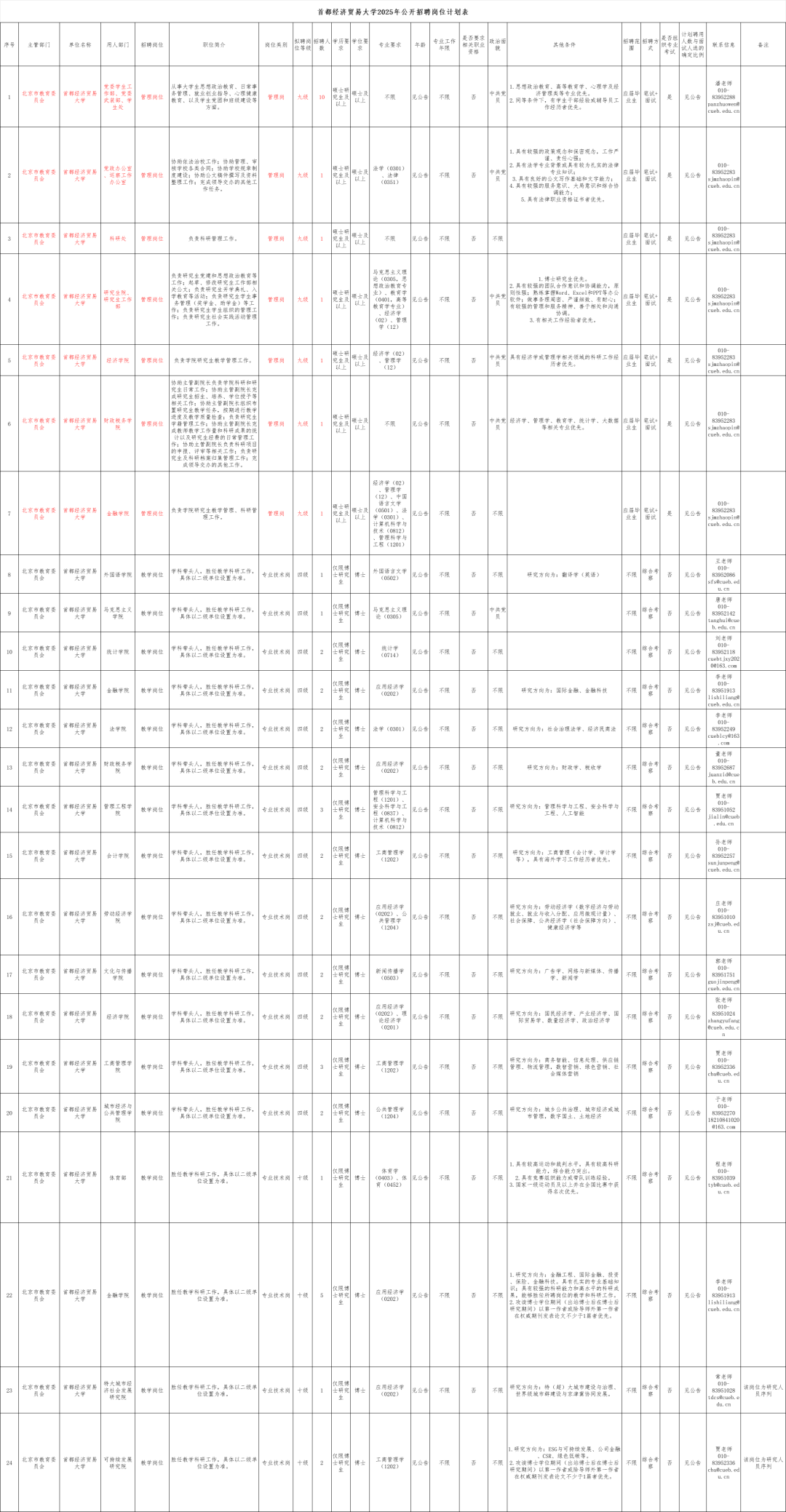 教学岗位应聘者咨询请与具体公司(部、研究院)联系,相关联系方式详见附件“首都经济贸易大学2025年公开招聘岗位计划表”。