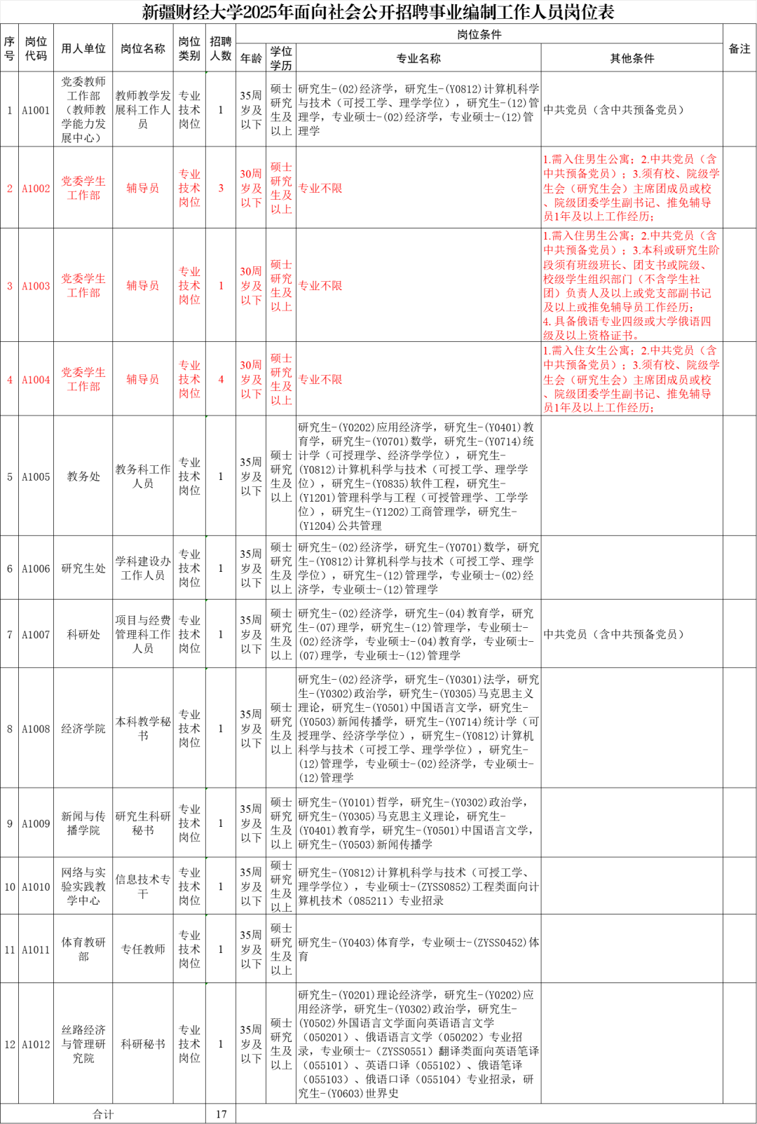 面向社会公开招聘,符合岗位条件的人员均可报名应聘。具体岗位条件详见《新疆财经大学2025年面向社会公开招聘事业编制工作人员岗位表》(附件1)。